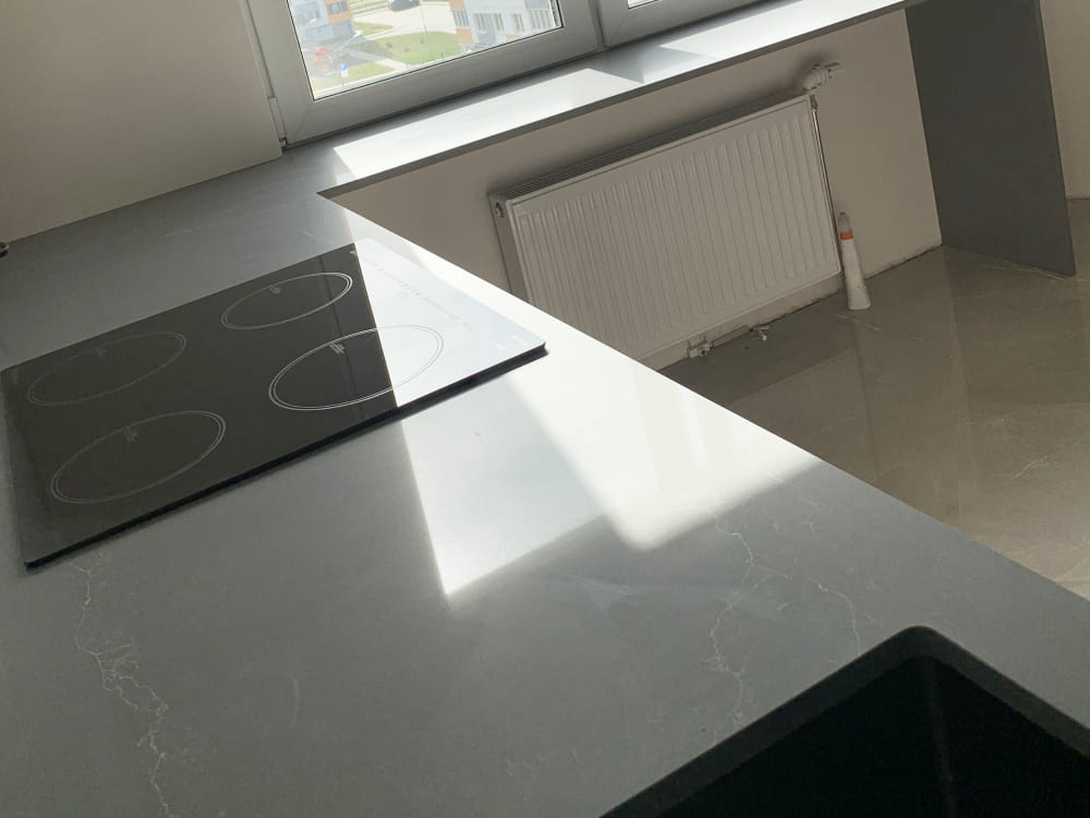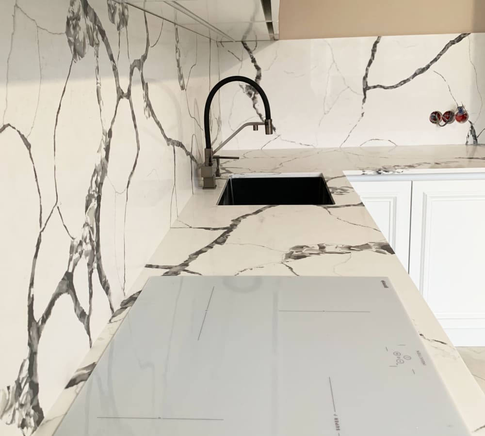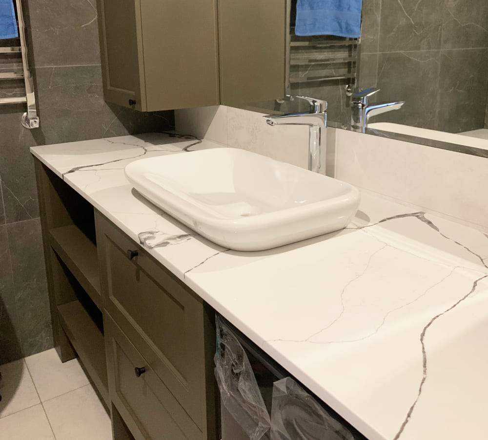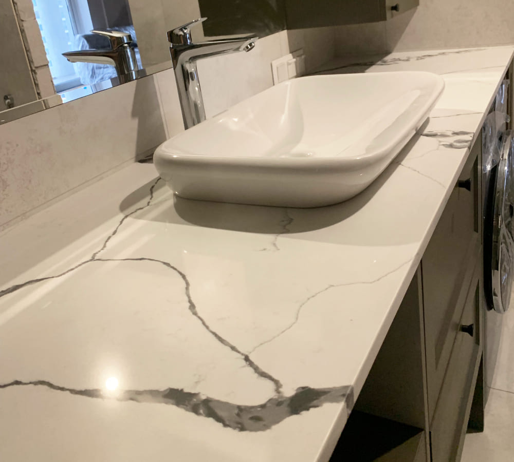 Кварцевый камень выдерживает удары, перепады температур и влагу, что делает его идеальным для кухни, ванной и фасадов.