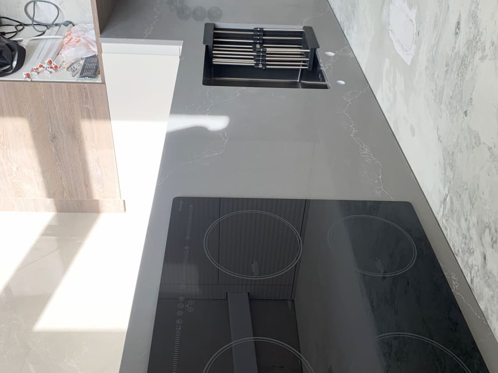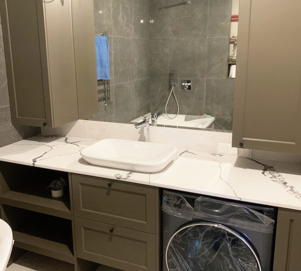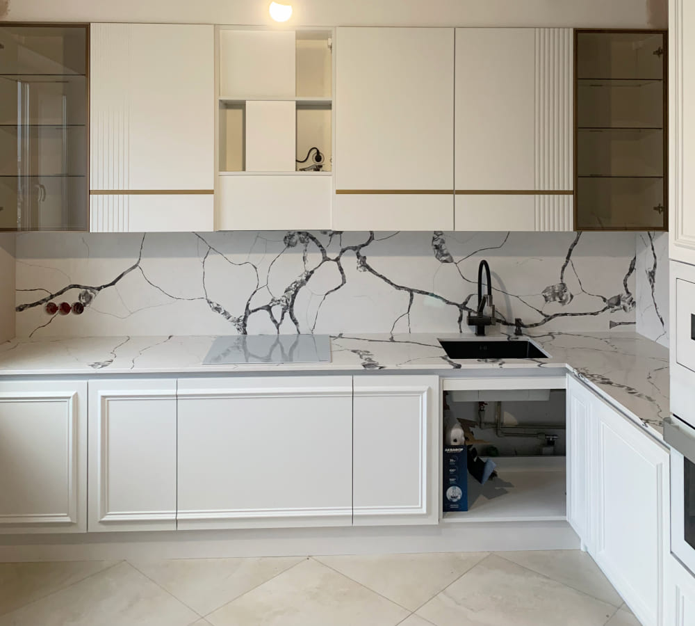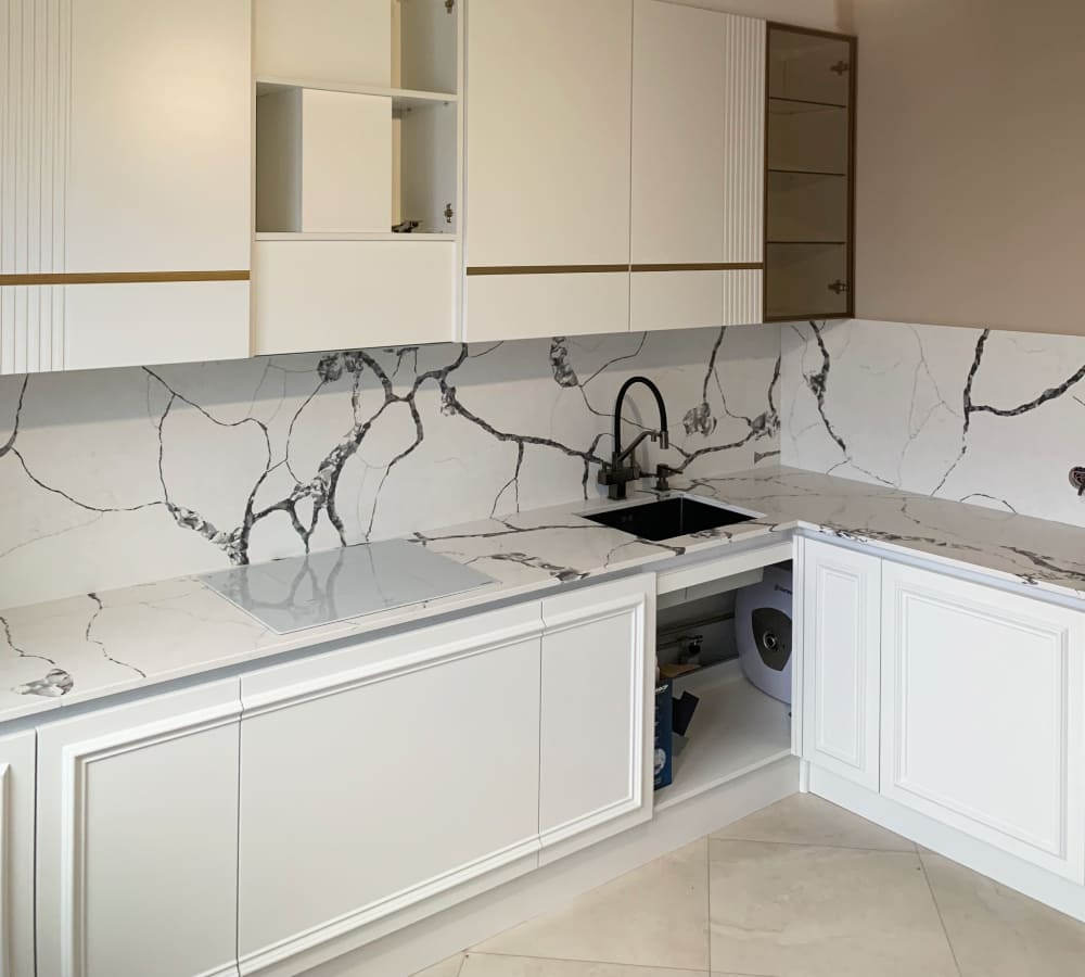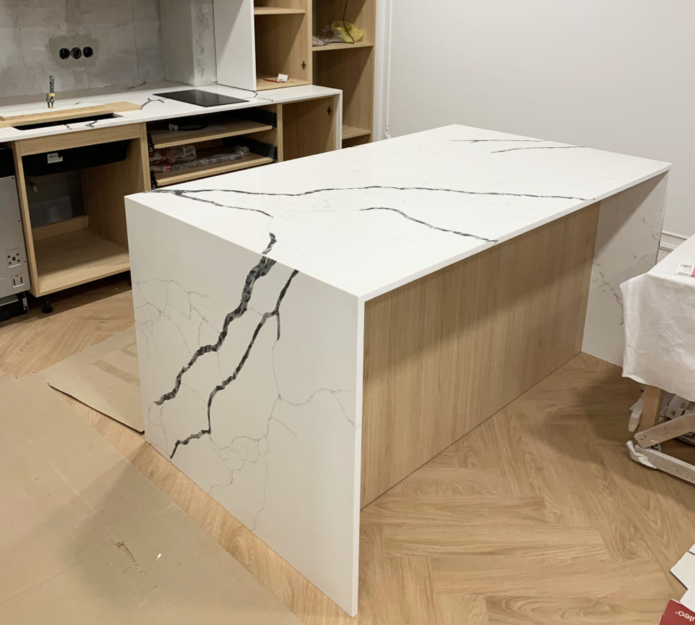 Кварцевый камень выдерживает удары, перепады температур и влагу, что делает его идеальным для кухни, ванной и фасадов.